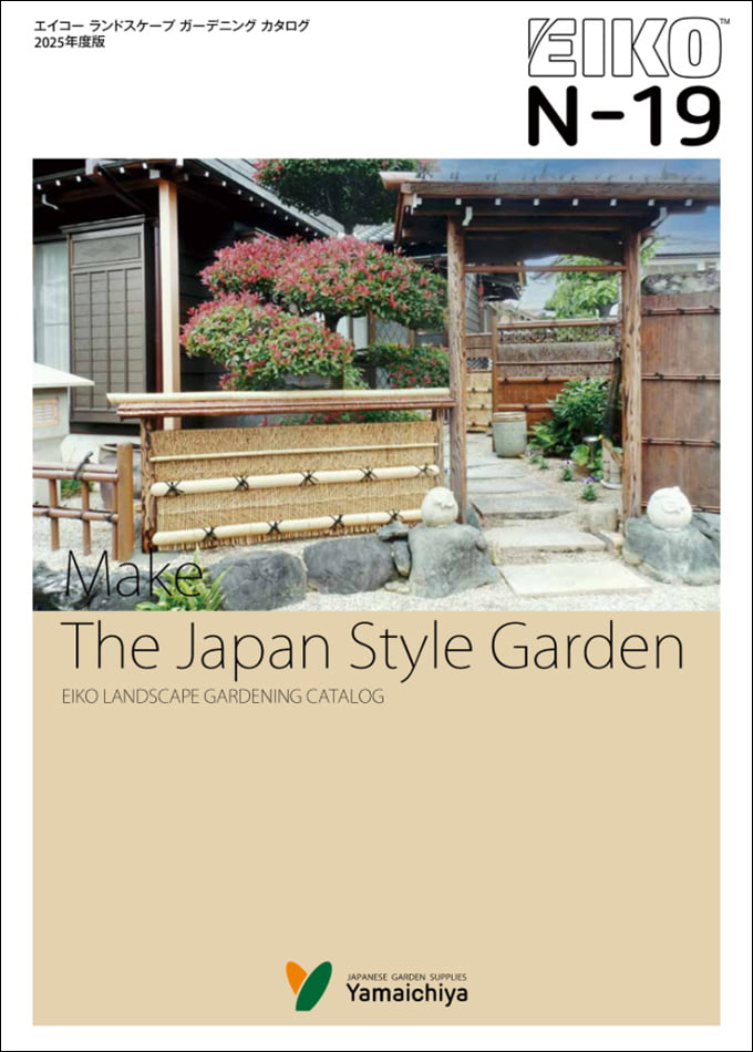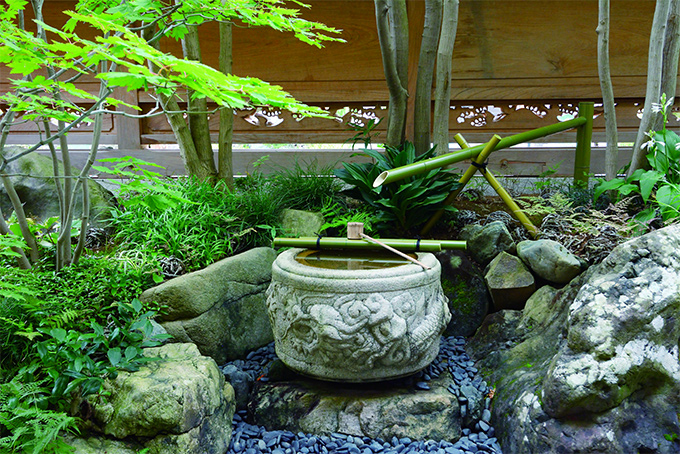 青竹の長尺カケヒと個性的なつくばい。和の庭に欠かせない添景物にも住む人の意図が感じとれます。
