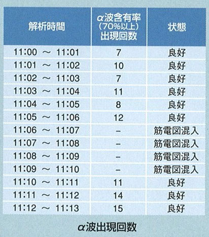 ・大量のマイナスイオンを発生。細胞の活性化や免疫強化、自律神経の調整、精神安定、空気の清浄化などさまざまな有効作用があり、リラックス状態にある時にあらわれるアルファ波を観測し検証すると、下記のデータのとおり大谷石空間においてα波が充分に観測され、癒し効果が実証されました。(低温のためにあらわれたと見られる筋電図は対象外とした。)