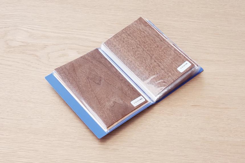 「世界の銘木標本集」とは、施工や制作時によく使用されるツキ板を、便利なハガキサイズのファイルに集めた商品です。この商品には、実際の天然木を薄くスライスした見本が収録されており、印刷ではなく本物の木材を使用しているため、質感や色合いを実際に手で触れて感じることができます。収録されている樹種は54種類あり、目次も付属しているため検索もしやすく、また収録樹種以外にも、木の産地を分かりやすく紹介しています。ハガキサイズであるため、持ち運びに便利で、出先での打ち合わせ時にも活用できます。全体的に、使いやすく、木材について知識を深めるのにも最適な商品です。