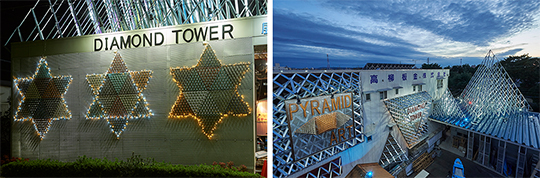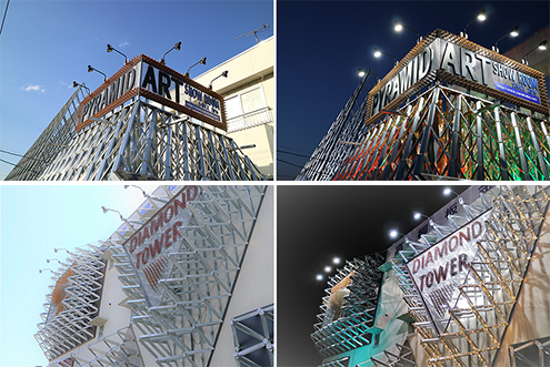 屋根や外壁からダイヤモンドタワーを組み立て、奇抜な看板アートを演出できます。