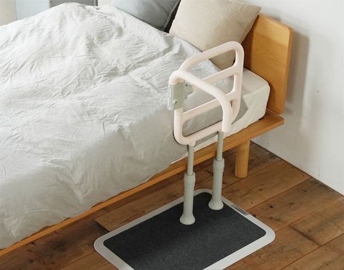 ベッドでは転落防止サイドレールと立ち上がり補助手すりの兼用として。また、壁に取り付けた手すりまでの動線確保としての手すりや廊下での歩行補助としても使用できます。