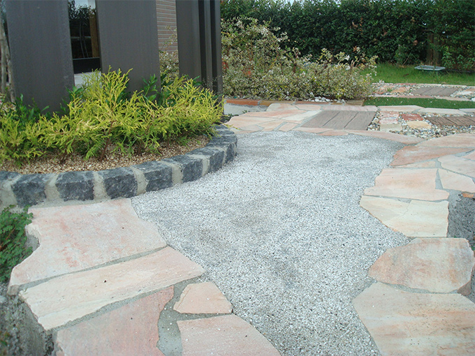 寒水石を配合することでさらに強度を高めた天然石舗装材