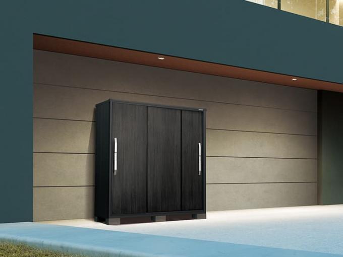 ヨド物置エスモから本体色をブラックにした「ブラックエスモ」です。ヨドコウならではの高級印刷鋼板を使用したブラックエスモ限定の木目調扉色「ウッディマロン」もラインナップ。