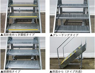 左から:高耐食めっき鋼板タイプ、グレーチングタイプ、縞鋼板タイプ