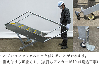 本製品は必要な場所に必要な数の階段を設置でき、また取外し・後付けなど設置場所の変更も可能なため、トラックバースでの作業者の動線確保・安全等に役立ちます。