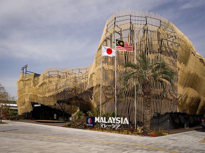 マレーシアの南国の自然を感じさせる設計には隈研吾建築都市設計事務所様が手掛け、万博開幕後とても賑わいのあるパビリオンです。