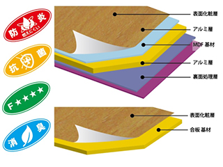 消臭機能や耐摩耗性・耐汚染性に優れた商品もあります。MDFタイプ2.5mmは防炎製品、合板タイプ2.5mmは防炎物品にて認定所得しております。