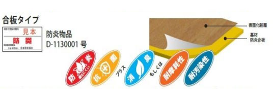 ・防炎機能で燃えにくい家具製品や建具製品・内装建材や腰壁など幅広い用途でお使いいただけます。