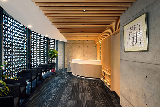 素材は江戸時代から作られてきた福井県の地域ブランド“越前瓦”、ヒントは福井県の地場産業“繊維”。その二つを掛け合わせ壁面を魅せる素材として完成した「ウーブンセラミック越前」瓦が織りなす美しい形、越前瓦独特の落ち着いた「銀鼠」の色合いが目を引きます。