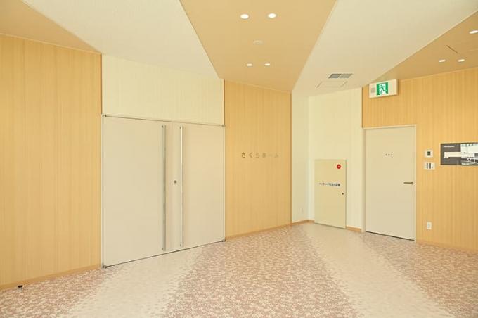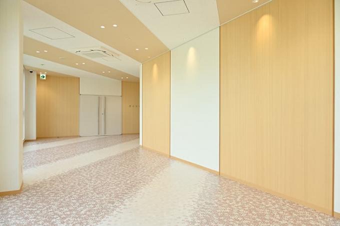 ▲吉野桧を使った吉野プレミアムシートの風合いと、床一面に散りばめられた桜の花びら模様が、やわらかな表情の空間を生み出します。