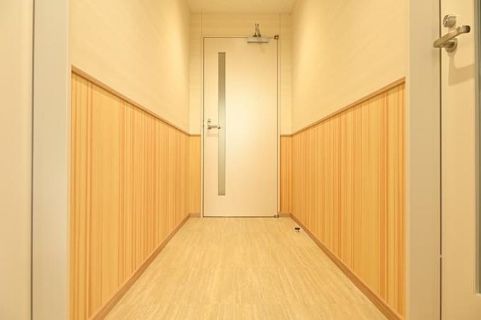 ▲<廊下>間接照明のやわらかな光が吉野プレミアムシートを優しく照らし、天然木の風合いがリラックス効果のある空間を作ります。