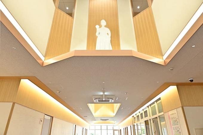 ▲<エントランス>吉野プレミアムシートを背景にナイチンゲール像が学生の皆さんをお迎えします。