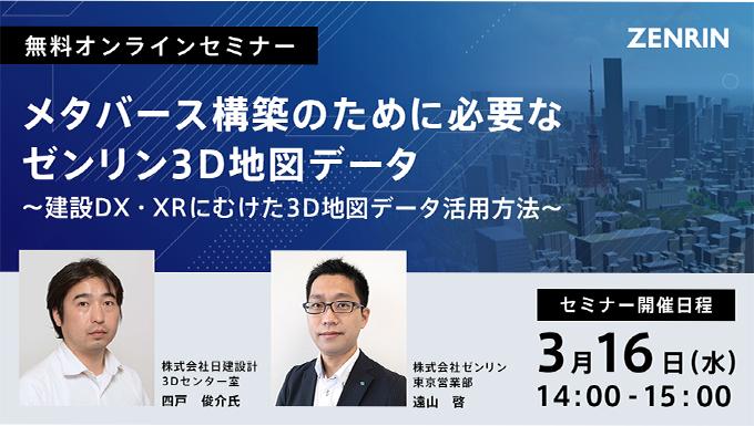 株式会社ゼンリン(本社:福岡県北九州市、代表取締役社長:髙山善司、以下ゼンリン)は2022年3月16日(水) 14時より、「メタバース構築のために必要なゼンリン3D地図データ~建設DX・XRにむけた3D地図データ活用方法~」と題してオンラインセミナーを開催します。