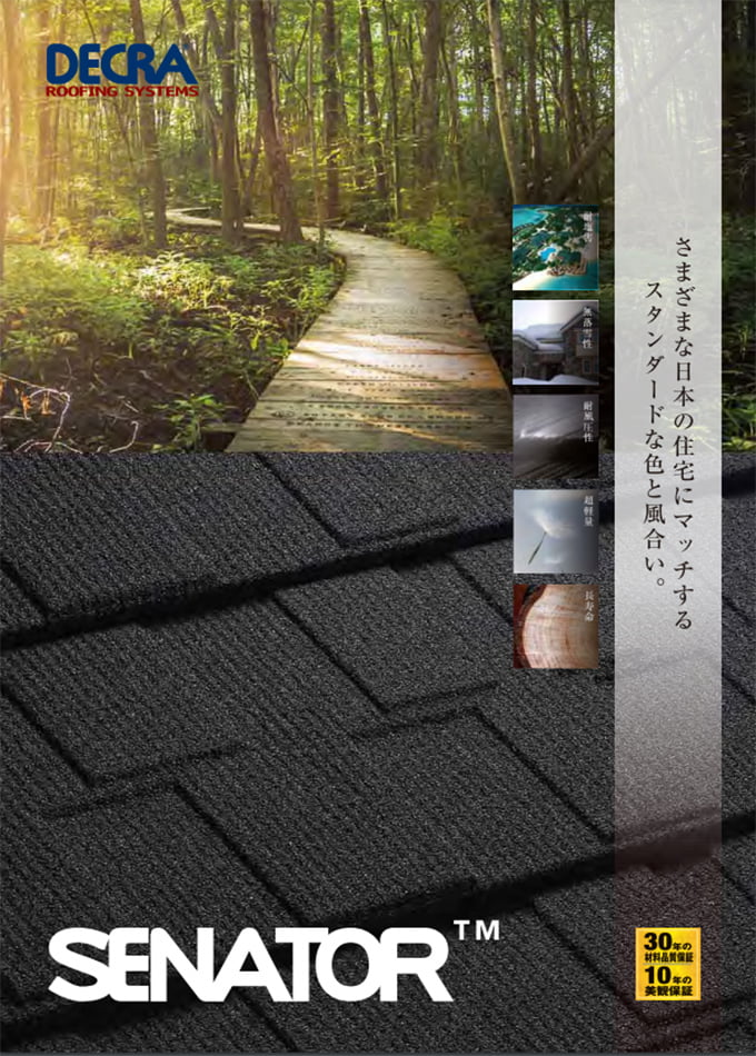 超軽量で災害に強い。Decra SENATOR(デクラ・セネター)はシングル調の美しい形状を実現しながらも、耐候性に優れた屋根材です。 人気のガルバリウム鋼板と天然のストーンチップを施しているので塗り替えいらずのメンテナンスフリーの屋根材です。 30年の材料品質保証と10年の美観保証がついています。
