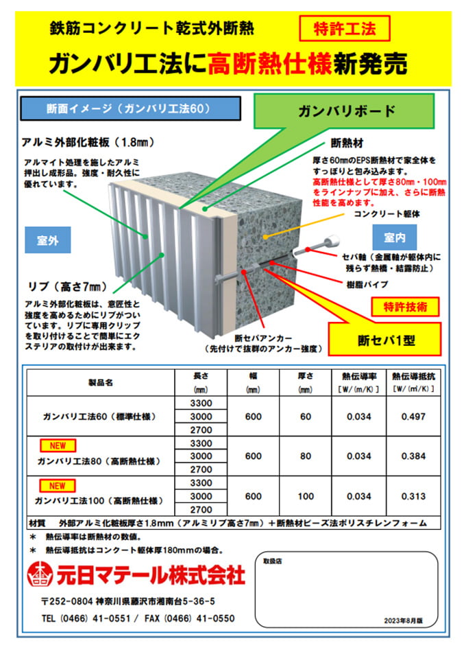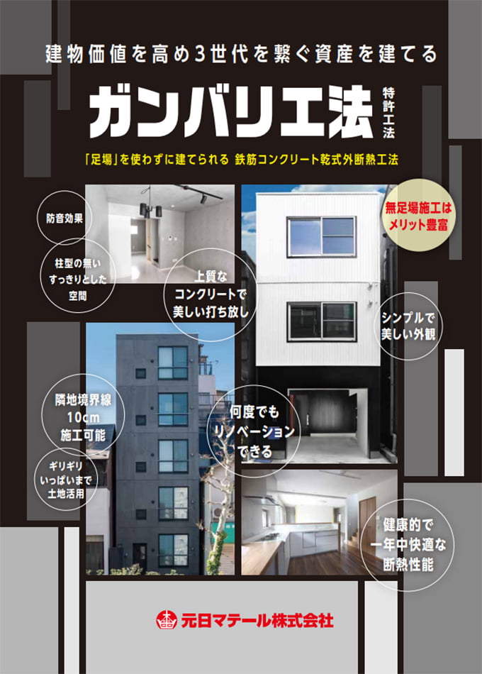 今までの鉄筋コンクリート外断熱工法とは異なり、「ガンバリ工法」ではガンバリボードを使用することで、足場・型枠・断熱・アンカー打ち・外部化粧・清掃が型枠工事だけで完了し、コンクリート工事・断熱工事・外部化粧工事を同時に終わらせることができる付加価値の高い工法です。