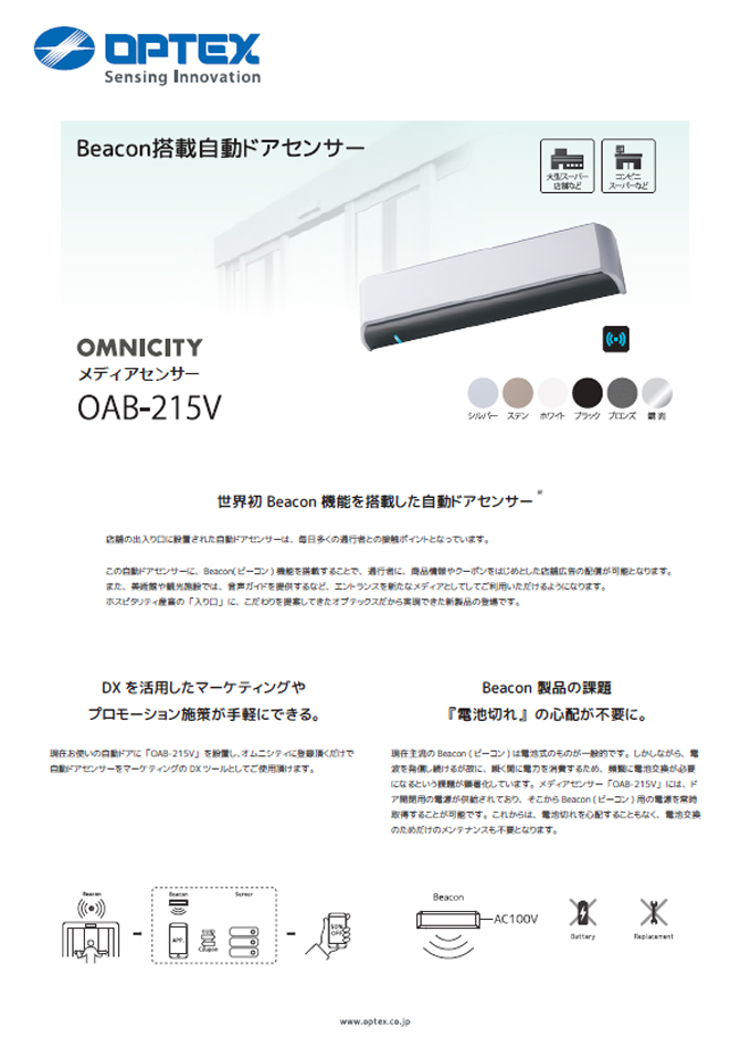 オムニシティ(OMNICITY)は、自動ドアを新しいメディアとして活用するシェアリングサービスです。建物のオーナーや店舗などの運営会社が情報発信ポイントとなる自動ドアをシェアし、マーケティングやプロモーションなど幅広い用途のサービスにご利用いただけます。世界初 Beacon 機能を搭載した自動ドアセンサー