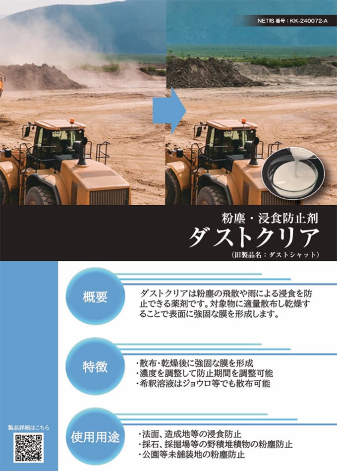 「マッドスベール」はダンプ架台への土砂付着を防止する薬剤である。土木工事等からの発生土をダンプで搬送する際、荷台に土砂が付着して滑り落ち切らない問題が発生しており、従来はドライバー等が人力で対応していた。本製品は積載前の架台に直接散布して同量の水を散布することで付着防止面を形成することができる。施工時に機材等を必要とせず、散布もある程度一様であれば良いため施工性に優れ、1回の使用で2~5回分の荷下ろしに対応可能で経済性に優れる他、作業性の向上や運搬回数の削減はCO2削減にも貢献する。