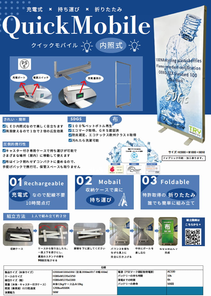 両面使えるので1台で2倍の広告効果、工具不要・約10秒で組立ができます。
