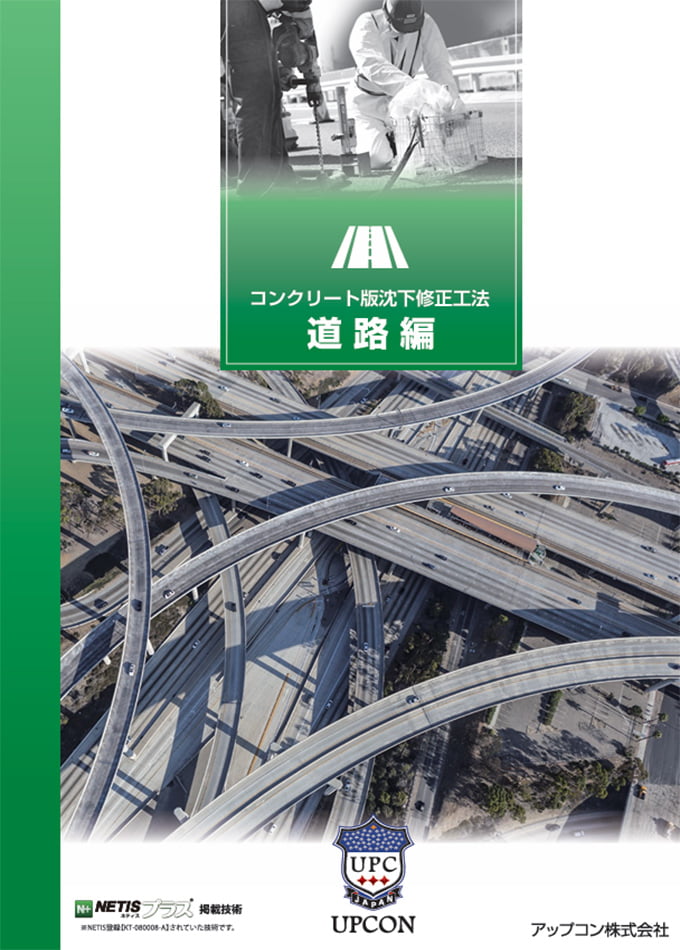 アップコンでは、高速道路などで多用されているコンクリート舗装版に生じた段差や沈下の変状を、専用に開発された高強度ウレタン樹脂を使用して、素早く解決します。アップコンのコンクリート舗装版沈下修正工法は、既存の舗装版を壊さず、開削工事を必要とせず、機動力の高いプラントを使用することで短工期を実現。供用停止の期間を最小限にし、計画的かつ効率的な維持管理に貢献しています。調査から工事まで一貫しておこない、アップコンは、コンクリート舗装版をはじめとした道路インフラの延命化に貢献しています。