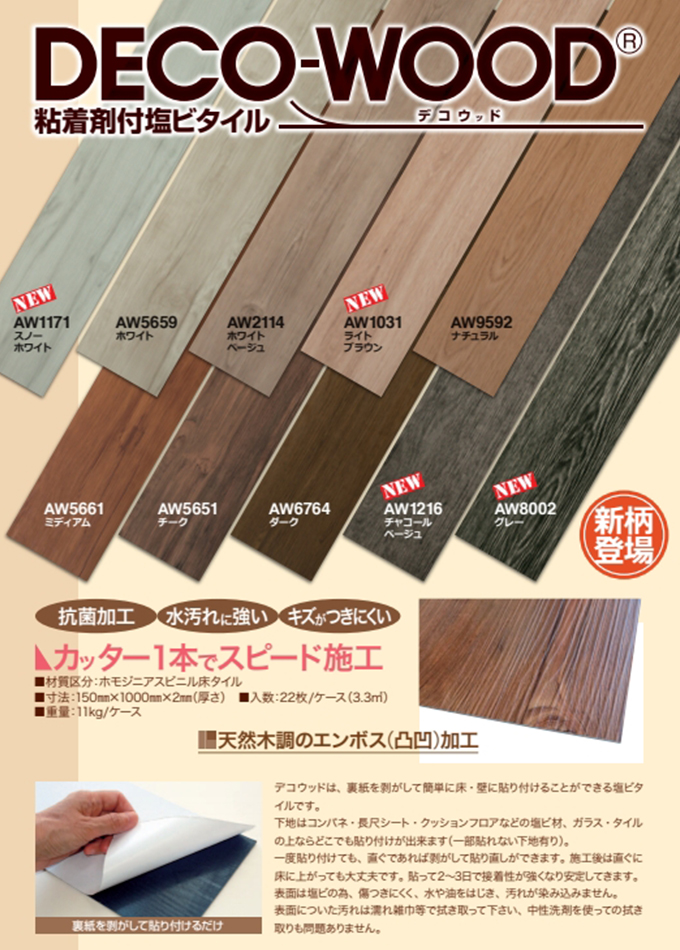 累計100万㎡以上の販売実績! 粘着剤付き塩ビタイル「デコウッド」