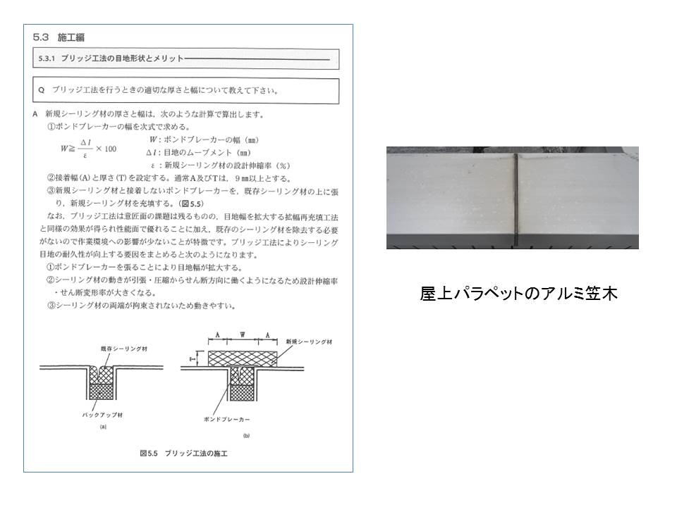 今回、大規模改修をするにあたって、笠木の突付部分のスキマに雨水が浸入して躯体に影響を及ぼさないようにする為に、シーリングをまたがせるブリッジ工法を行おうと考えております。