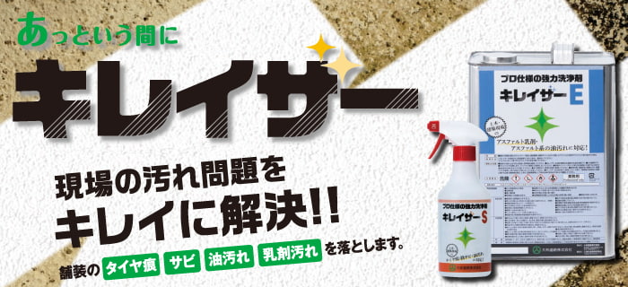 キレイザーは、舗装や道路付帯設備の汚れ(油、乳剤、サビやタイヤ痕など)に効果のある洗浄剤です。界面活性剤の作用により、汚れを浮き上がらせます。キレイザーは汚れや適用箇所に応じて2つのタイプ(キレイザーS、キレイザーE)をご用意しています。