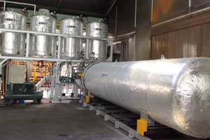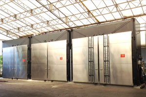 蒸気式乾燥機、不燃木材の乾燥には生蒸気を使わず熱風を循環させ乾燥、遠赤外線の効果も利用。