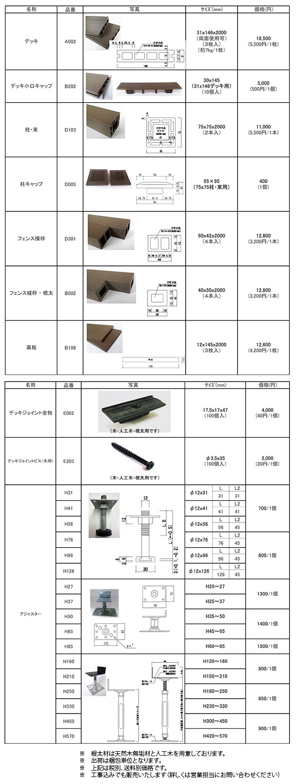 ウッディワールド( 株) の人工木デッキ部材・部品・金物価格表