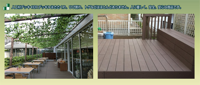 弊社のER デッキは、中国で生産しリサイクルを完成した商品です。地球にも優しく、人にも優しい商品です。メンテナンスフリーのデッキです。