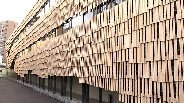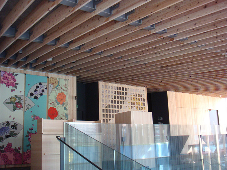 不燃・杉(内装の壁材と天井ルーバー材)【浅草文化観光センター】