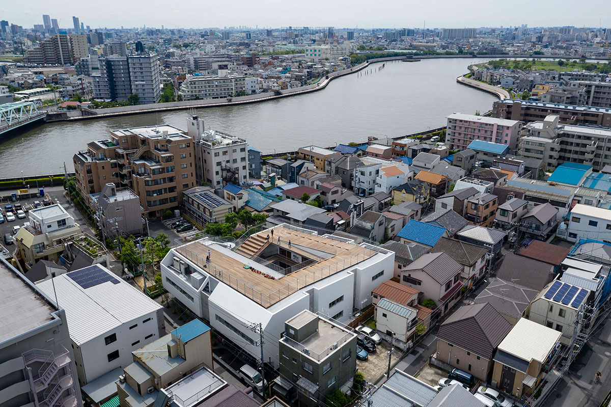 今日、共働きの両親を支える保育サービスの拡充は全国各地で求められている。ただ、地域施設としての保育園は、小中学校よりは規模が小さく立地もさまざまであり得るため、周辺地域との関係を中心に建築計画上の課題は「保育園はこう」というふうには絞りにくく、プロジェクトに固有の答えを出せる建築設計者の力に期待がかかる。 東立石保育園は葛飾区の海抜ゼロメートル地帯に建つ。周辺は住宅が建て込んでおり、音環境制御、安全管理等の観点からも、唯一外部空間にゆとりのある公園側の一面だけをオープンにし、通園を中心とする人の往来はここに絞る方法が採られた。そこを入ると園内広場があり、子どもたちのいるスペースも管理部門の諸室もすべてこの広場に面する形になっている。