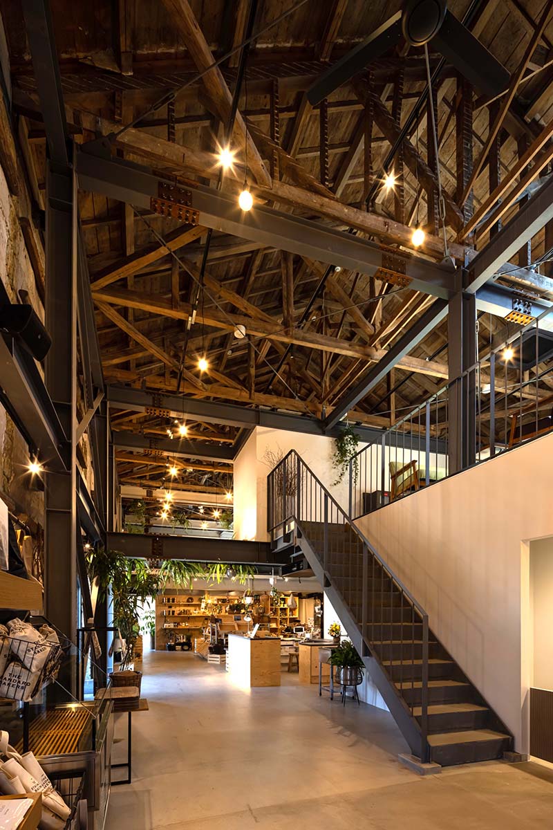 構造材として多くを期待しにくい既存の大谷石はそのまま残し、その中に鉄骨の構造骨組みを挿入することで、若い感性にも響くデザインのホテル、物販店、カフェ付きパン屋の場をつくり出した。大谷石の存在感が効いている。これ以前の第一段階では、同じく広場を囲む旧農協事務所棟を地元食材中心のイタリアン・レストランにリノベーションし、この後の第三段階では、広場を囲む他の元倉庫のリノベーションと周辺地域の空き家活用等に展開する計画だとのこと。日本の美しい農村の風景が人々の新しい活動によって守られていく明日。それを感じさせてくれるプロジェクトである。