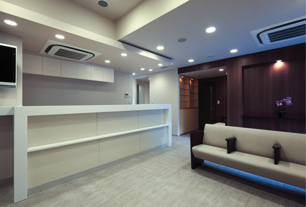 第一は、いままでの長い廊下状の待合スペースを、天井の高い明るいフォワイエ・ラウンジ空間とし、来患者を気持ち良く迎え入れる「しつらえ」をつくることでした。待合スペースの見せ場となる受付カウンターは人造大理石(コーリアン)によって存在感のある彫刻的な造形としました。