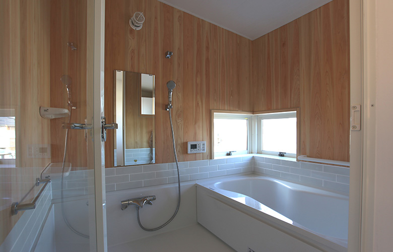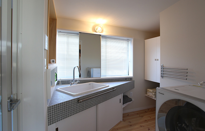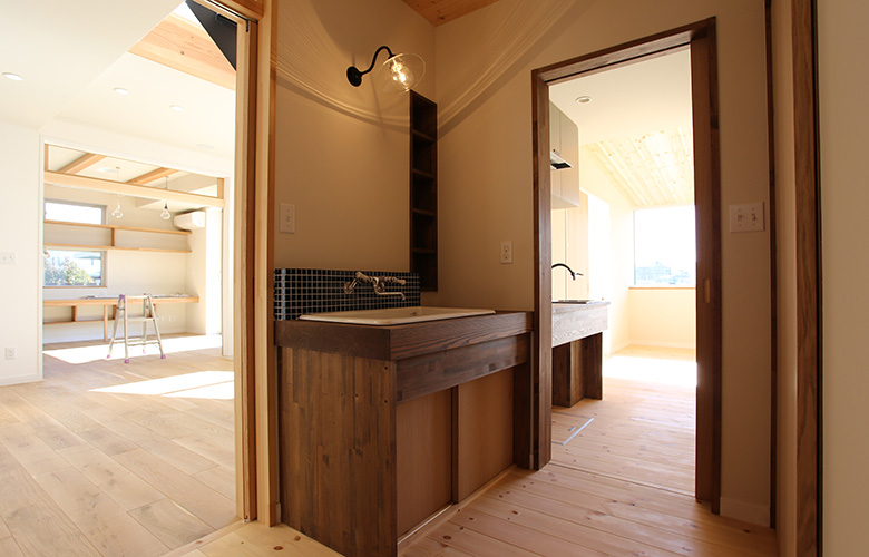 さらに壁は水回り以外を漆喰塗と珪藻土クロス(サンゲツ)、天井は珪藻土クロスとパイン板張りとし、湿度の高い時に湿気を吸い、乾燥している時に湿気を放出してくれる呼吸する材料を使用しました。