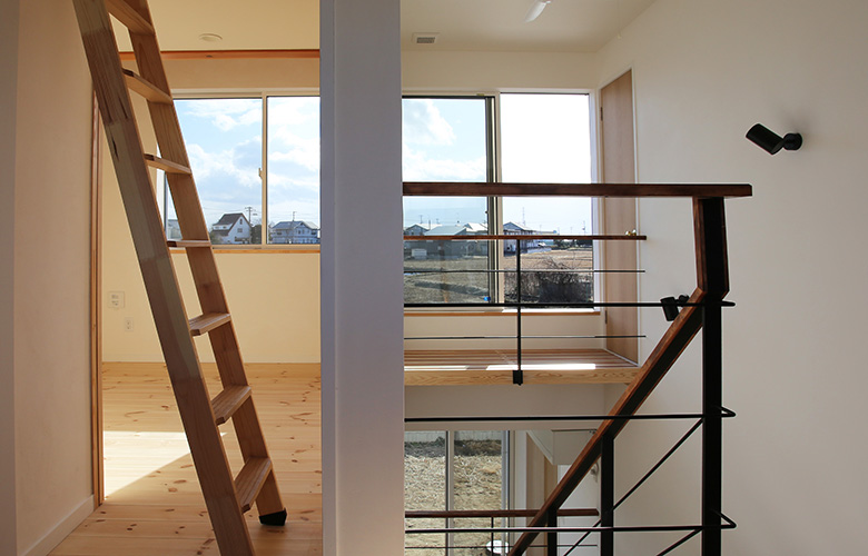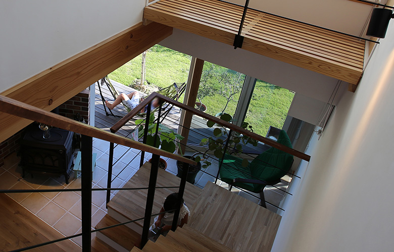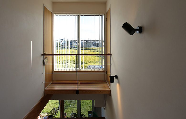 居間の土間部分に薪ストーブを置き、階段・吹き抜けを通し、2階に暖気を送るようにしています。奥のサンルームとバルコニーのある寝室の前面に洗面・脱衣洗濯室と北の山並みを望む浴室を設けました。すべての家族居住空間から南側田園の四季の移ろいを眺め、家中をそよ風が駆け巡る住まいとしました。
