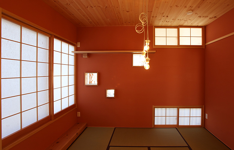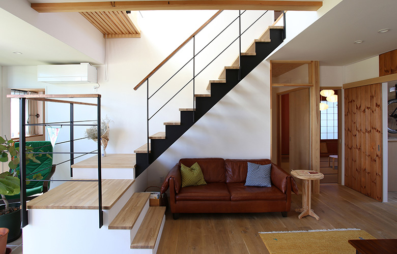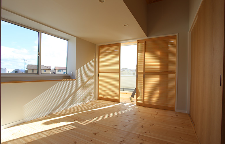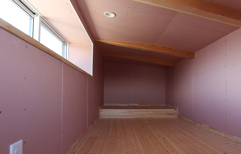 居室全部の入口を引き戸にするなど家全体を開放的な空間としたことから、ZEH (ゼロ・エネルギー・ハウス)基準の断熱性能としています。さらに万が一火災発生時の煙対策も考え、壁・天井断熱材は高性能グラスウール14kgを選択し壁に105mm、天井に155mm厚の断熱材で包み、壁内結露対策として外壁に通気層を設けました。