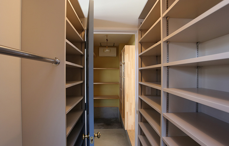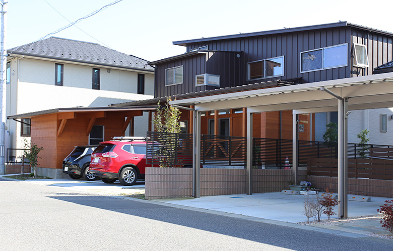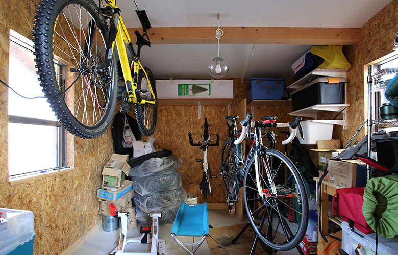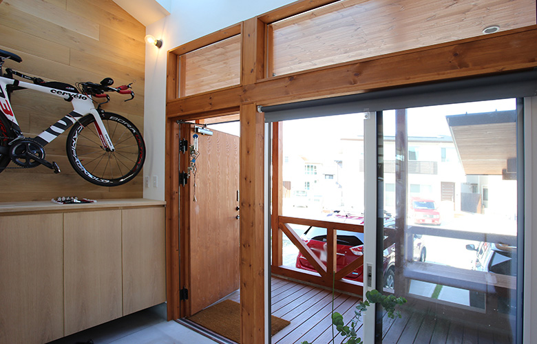 また、北の道路側アプローチと駐車スペースの一角に自転車競技の練習場も兼ねた外物置を設け、ポーチと外物置を軒下空間でつなぎました。軒下は作業空間にもなり、雨の日でも、駐車スペースから外物置前を通り玄関まで濡れずに行くことができます。