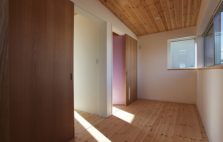 玄関にはトップライトと掃き出し窓を設け、北側に位置していますが開放的で明るい空間です。また、玄関脇にクロークを設け、その奥を勝手口のある食品庫とし、住宅内部にも北側デッキと平行して土間空間を設け、屋外に続くキッチン隣接の家事空間としました。ダイニングキッチンは居間の間の引き込み戸によりLDKを一体でも単独でも使用可能です。 居間は予備室と和室に接しており、予備室には父母同居を見据えミニキッチン、隣接してトイレと洗面コーナーを設けております。そして一階各部屋は、すべて2方向屋内移動ができ、家の中を回遊できる廻れる動線にしました。