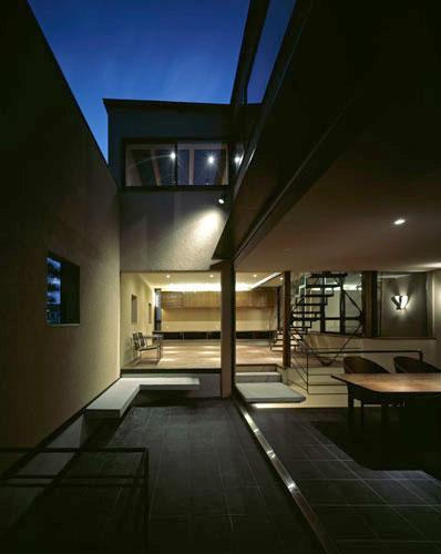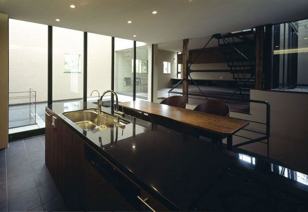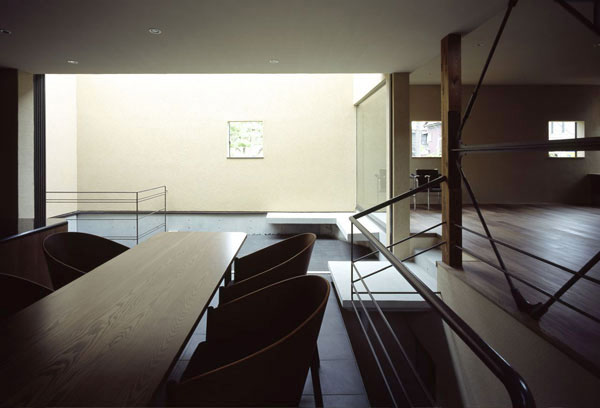 写真の実例は『上野毛T』での使用例です。中庭との間に建具が出てくるのですが、レールを見せない納まりにしていることもあって、内外の境界線が分からなくなっています。
