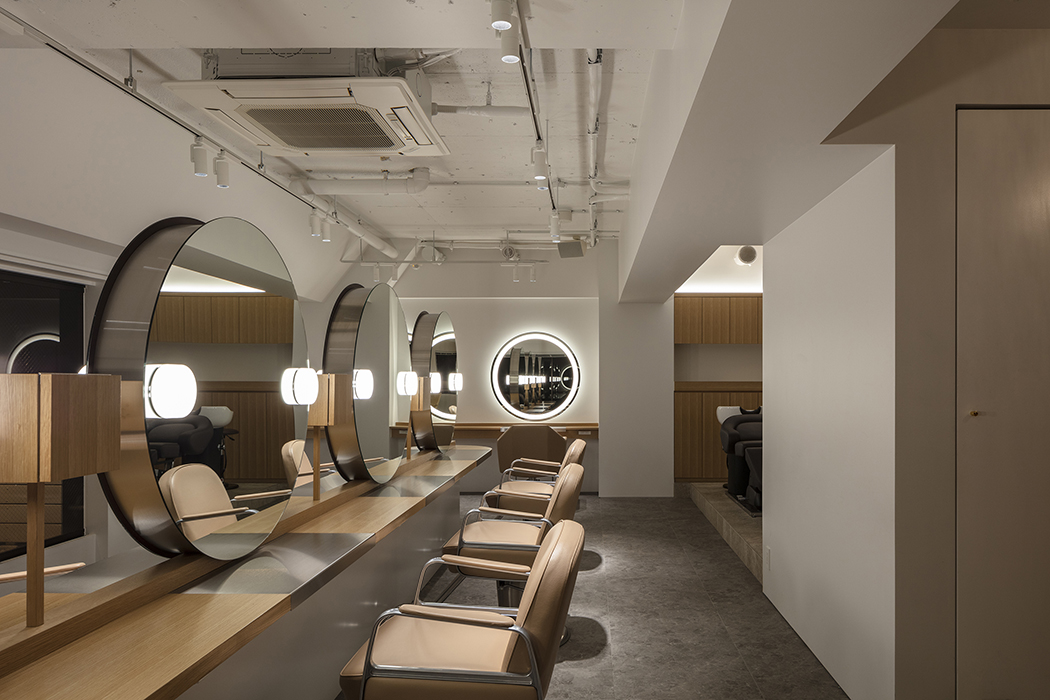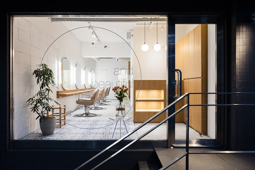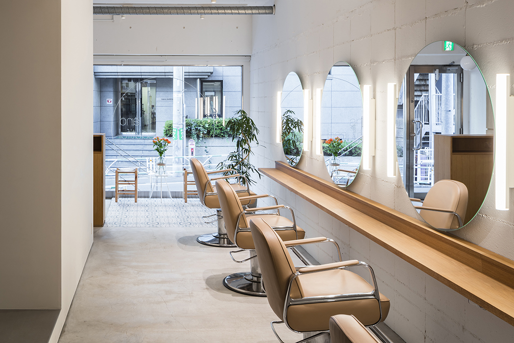 andbeautifulの新店舗としてお店のコンセプトは引き継ぎながらロングテーブルのカットスペースとサークル型の女優照明などを新たにデザインし、小さな変化で新しい空間体験を提供しました。