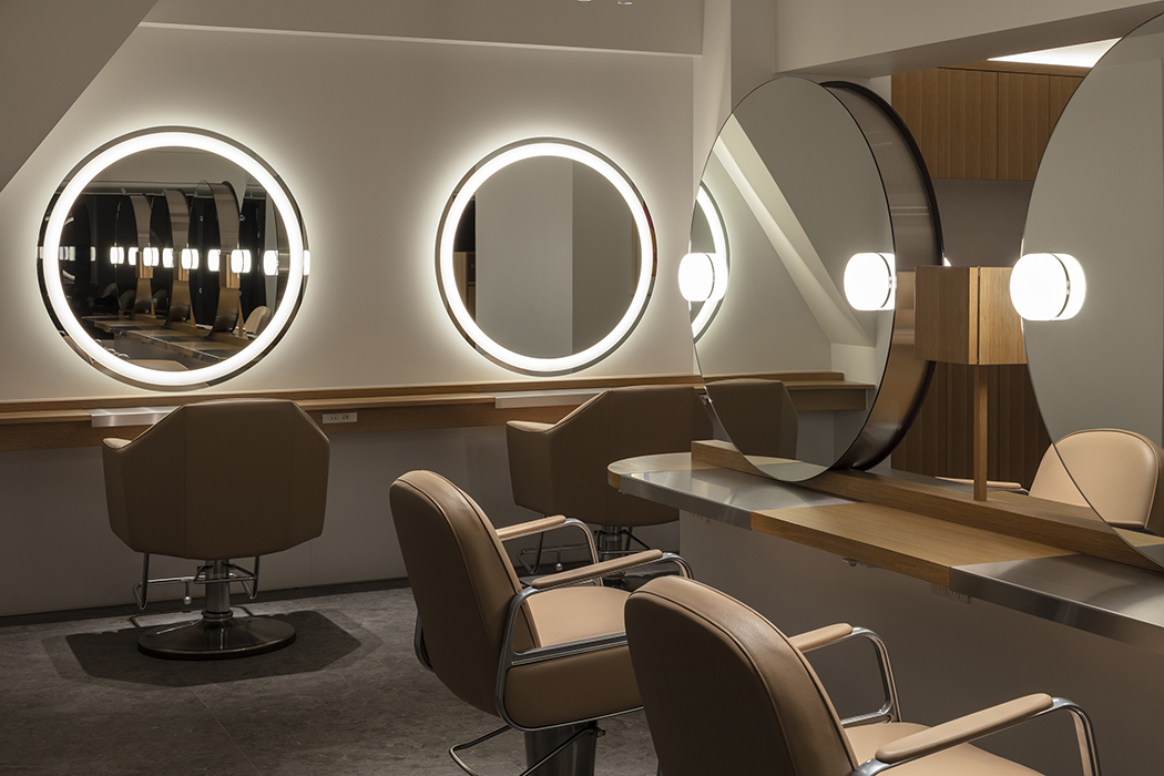 美容室として髪という浮遊感や、可愛さ、繊細さを感じさせる空間、お客さまとのコミュニケーションを大切にしたいという思いから、丸い大きい鏡と女優照明で明るく包み込むような空間としています。