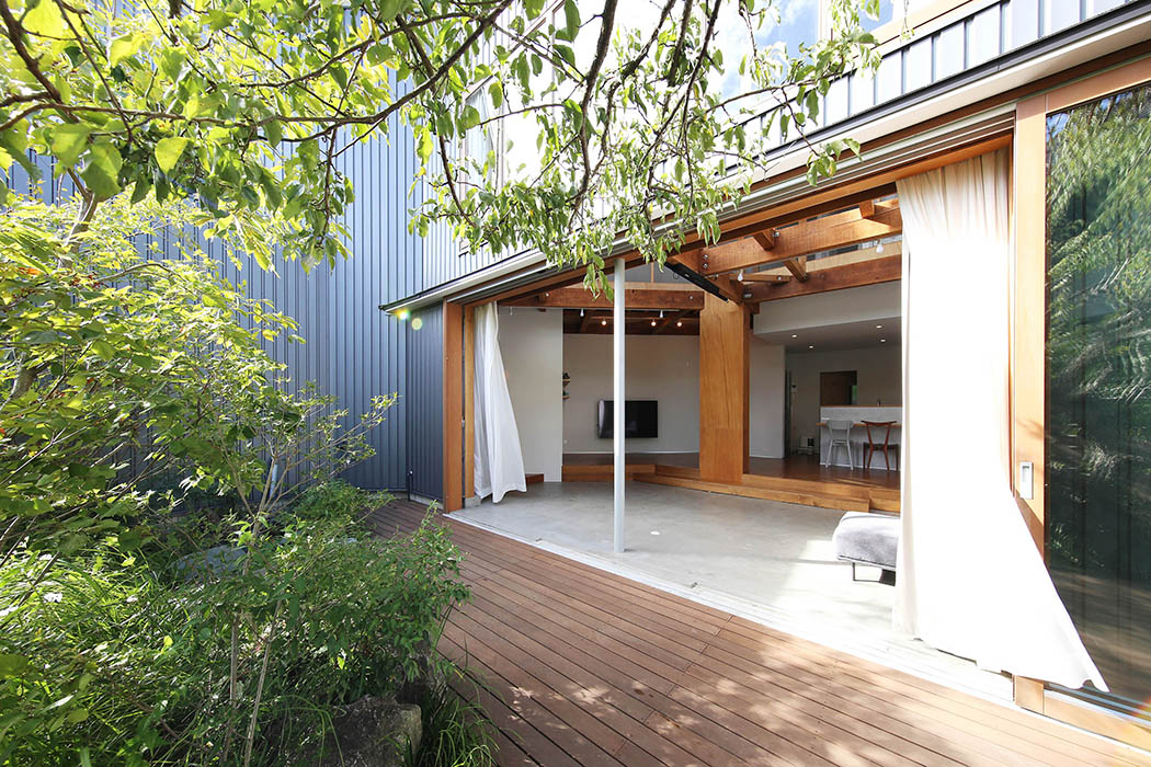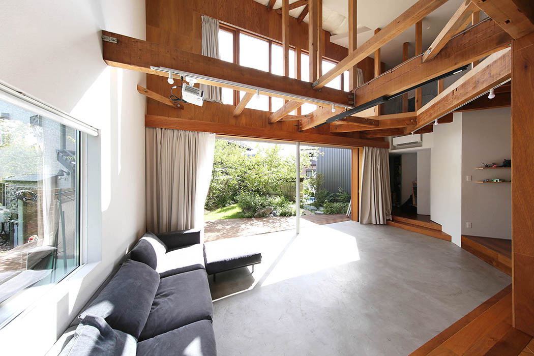築40年過ぎの空き家を再生する計画です。子どもの成長に合わせて住まい方を考えたいということで、周辺の緑を取り込みながら余白をつくるように計画しています。2階の床を取り払い吹き抜け上をつくり、1階の床を土間にしたリビングと庭が一体的な住空間としています。