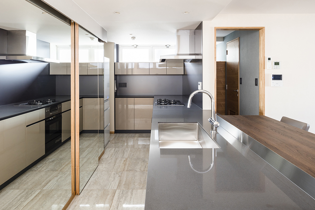 ホテルような住居とするため、リビングをラウンジとして携え、壁面収納で片づけやすい環境をつくり暖炉やオープンカウンターのキッチン等のおもてなしのしやすい空間としてます。