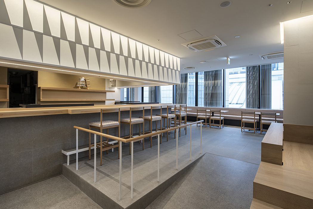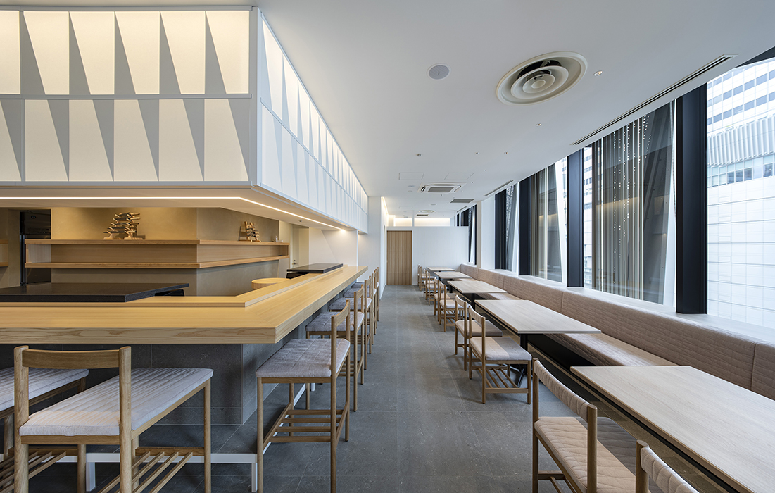 関西初出店となる羽田市場らしいお寿司屋さんとしてデザインを考案しています。 「羽」という文字からパターンをつくり光壁として空間に明るさや軽やかさを生み出しています。明るく眺望の良いお寿司屋さんです。