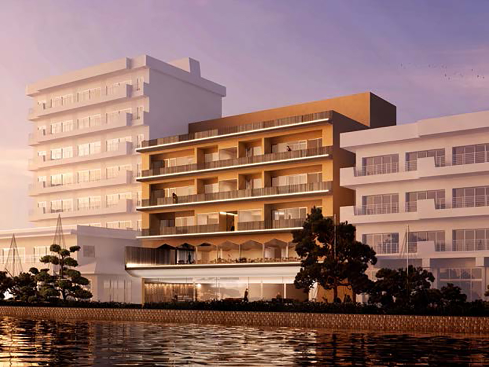 若女将もその考えに賛同してくださり、美湾荘では「ハレの切り通し」的な空間を提案しています。美湾荘自体は一部建て替えのため、道路側から見た外観は大きくは変わりませんが、元々前面道路近くにあったエントランスロビーの半分程度を無くし、そこを大きなピロティとして計画しています。ピロティの先はシンプルで大きな窓とし、海まで「抜け」感のある洞窟のように見立て、そこに人が吸い込まれていくような切り通し空間を表現できればと考えています。