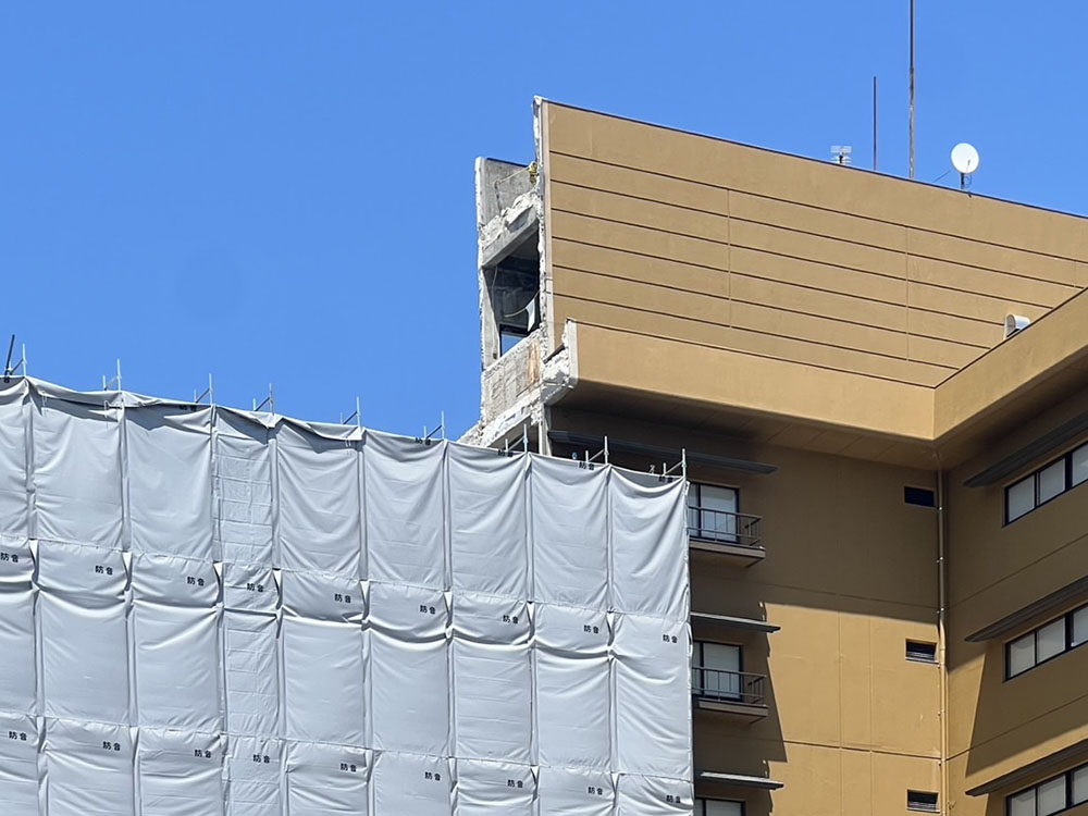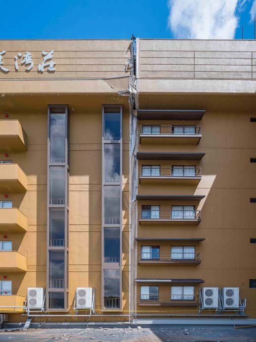 そんな変わり果てた故郷の様子を確認しながら、目的地の美湾荘へ向かいました。まず目に入ってきた外観は、想像していたよりも損傷が少ない印象を受けました。テレビで何度も目にしたエキスパンションジョイント(EXP.J)部分の亀裂は、現地で見るとさらに衝撃的でしたが、周囲の被害状況を考えると、これだけの被害で済んだのは不幸中の幸いだったようにも感じました。