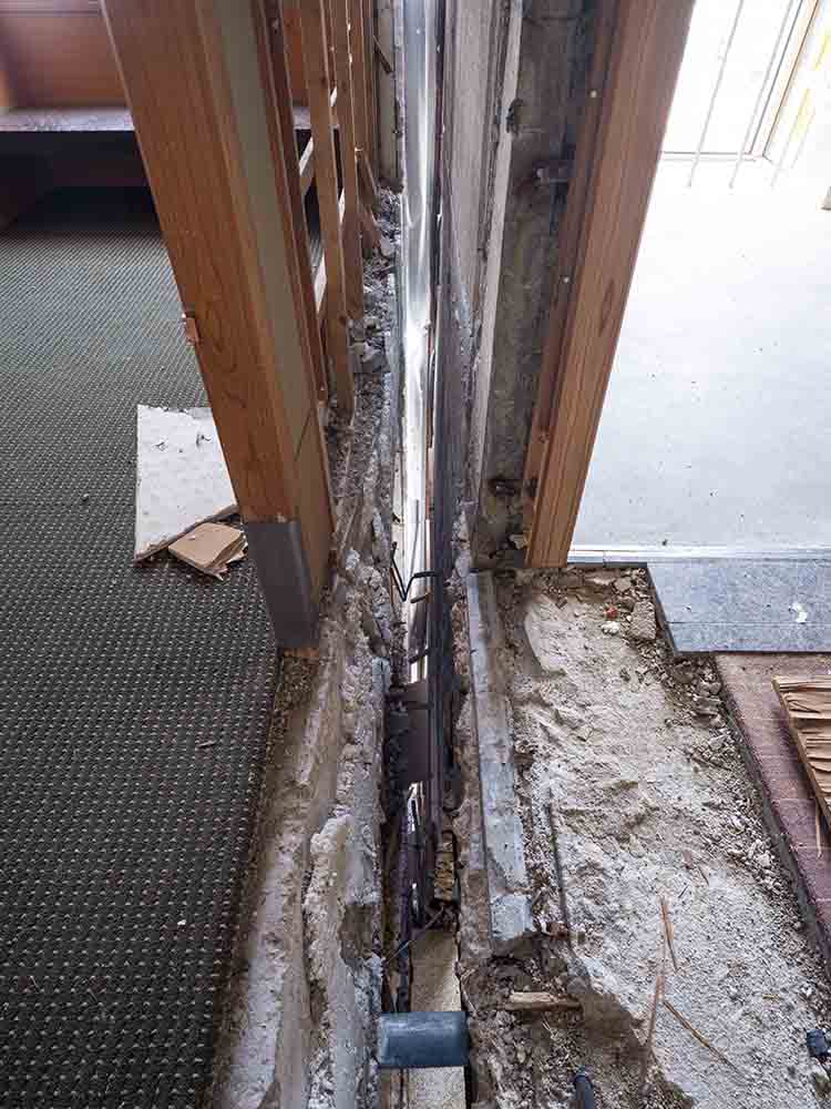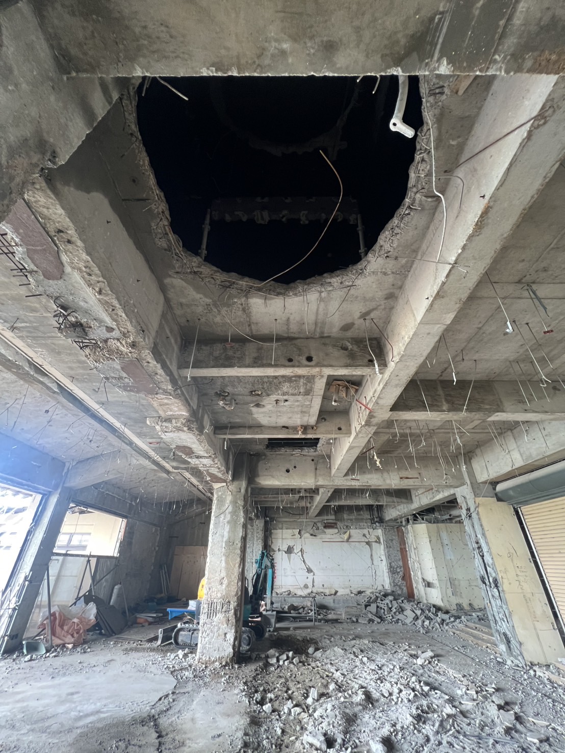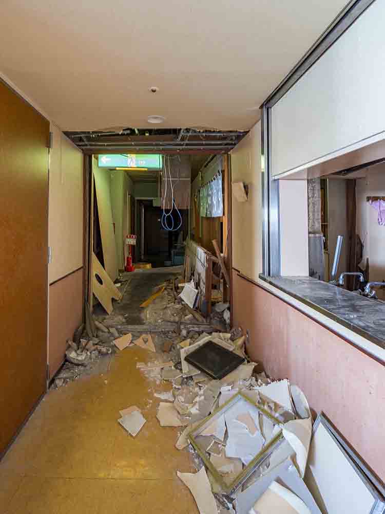 しかし、一歩内部へ入ってみると、外観からは想像できないほど多くの箇所で激しい損傷が確認できました。本来はフラットに繋がっていたはずの廊下は、棟間(EXP.J)で大きな段差が生じ、損傷を受けた側の建物がどれほど沈んだのかが一目瞭然でした。 地震が来る前までは、この建物で元旦という特別な時間が流れていたことを想像すると、本当にやるせない気持ちになります。