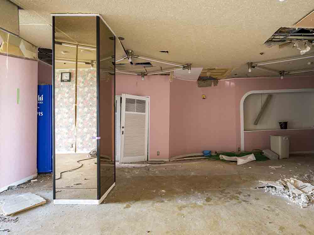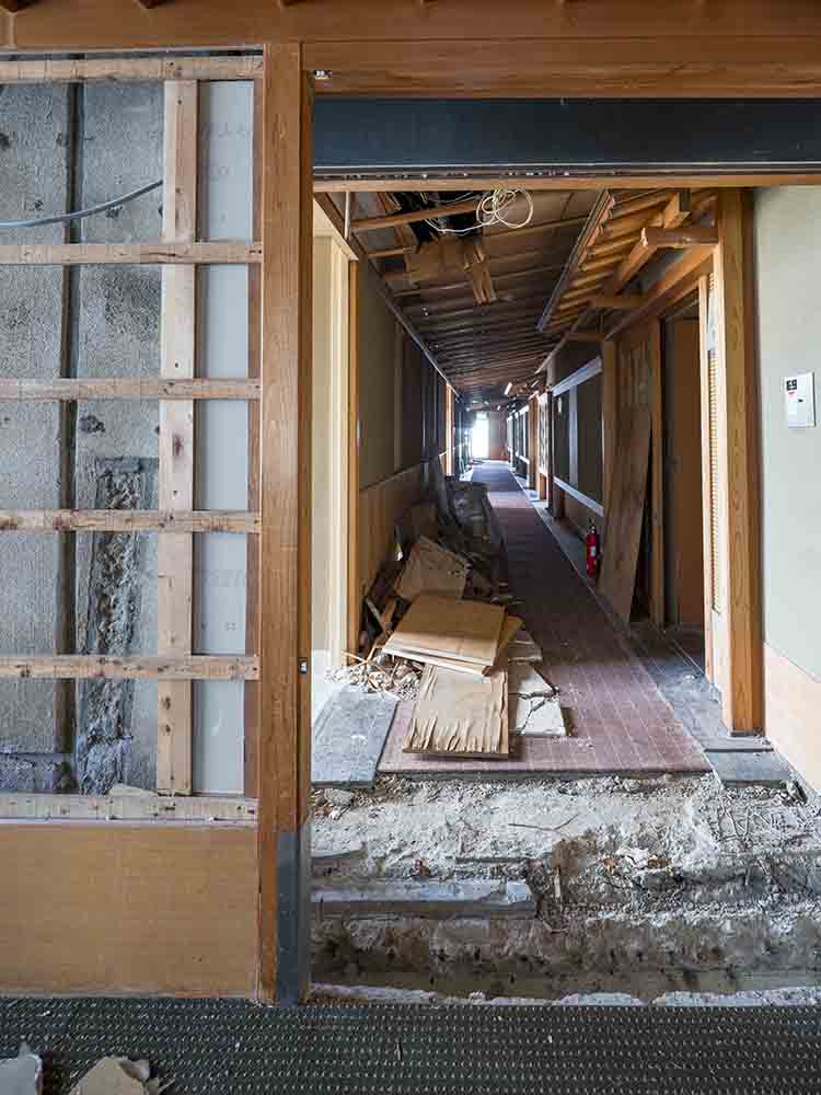 それから頻繁に被災状況の共有をしていく中で、震災から2週間ほど経過したときに、まずは現在解体中の白鷺亭棟の(特に損傷の激しかった)1階ロビーの改修設計の依頼がありました。私はその時点ではまだ現地に足を運ぶことができませんでしたが、以前から美湾荘と付き合いのあるゼネコンがこれからより詳細な調査を行うとのことでした。それから更に2,3週間経過した頃に、若女将から一本の電話が入りました。まずその第一声は、