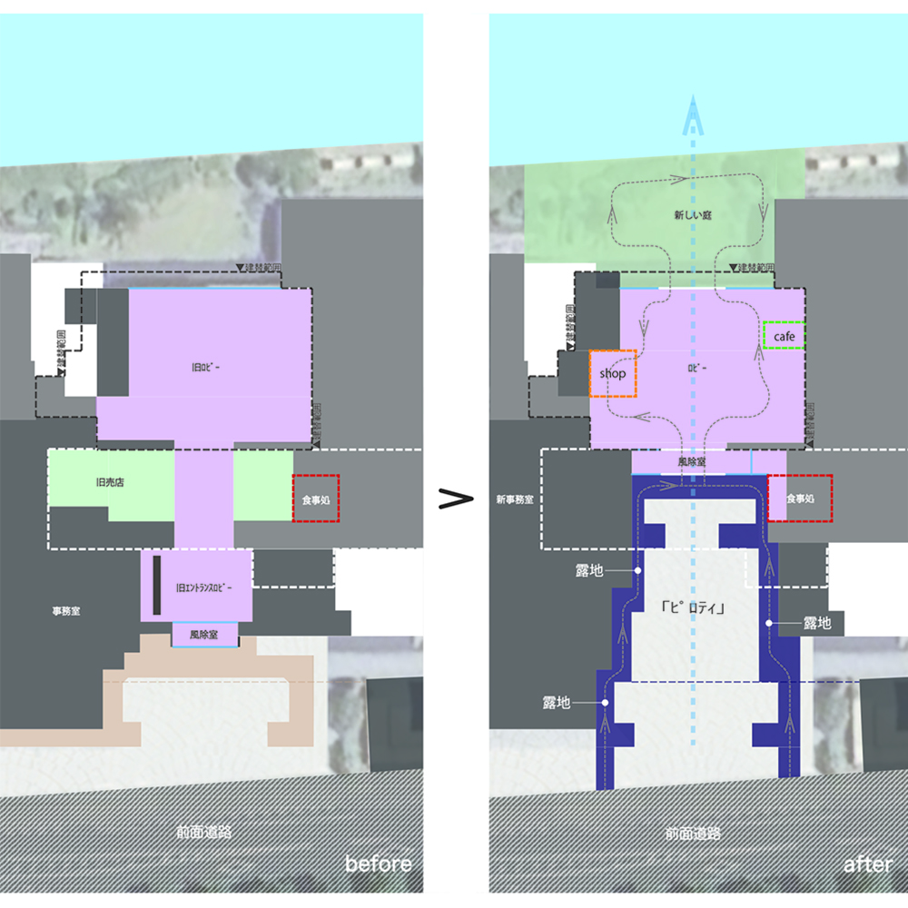 街からその抜けを介して海を感じられるだけでなく、プログラムとしても抜けの先に誰でも利用できるようなカフェを提案したり、時には海に面した庭の一部を開放したりと、旅館の一部が街の一部のように、そこが街の中の一つの「ハレの空間」となるような、そんな空間、そんな街を提案できないかと議論を続けています。