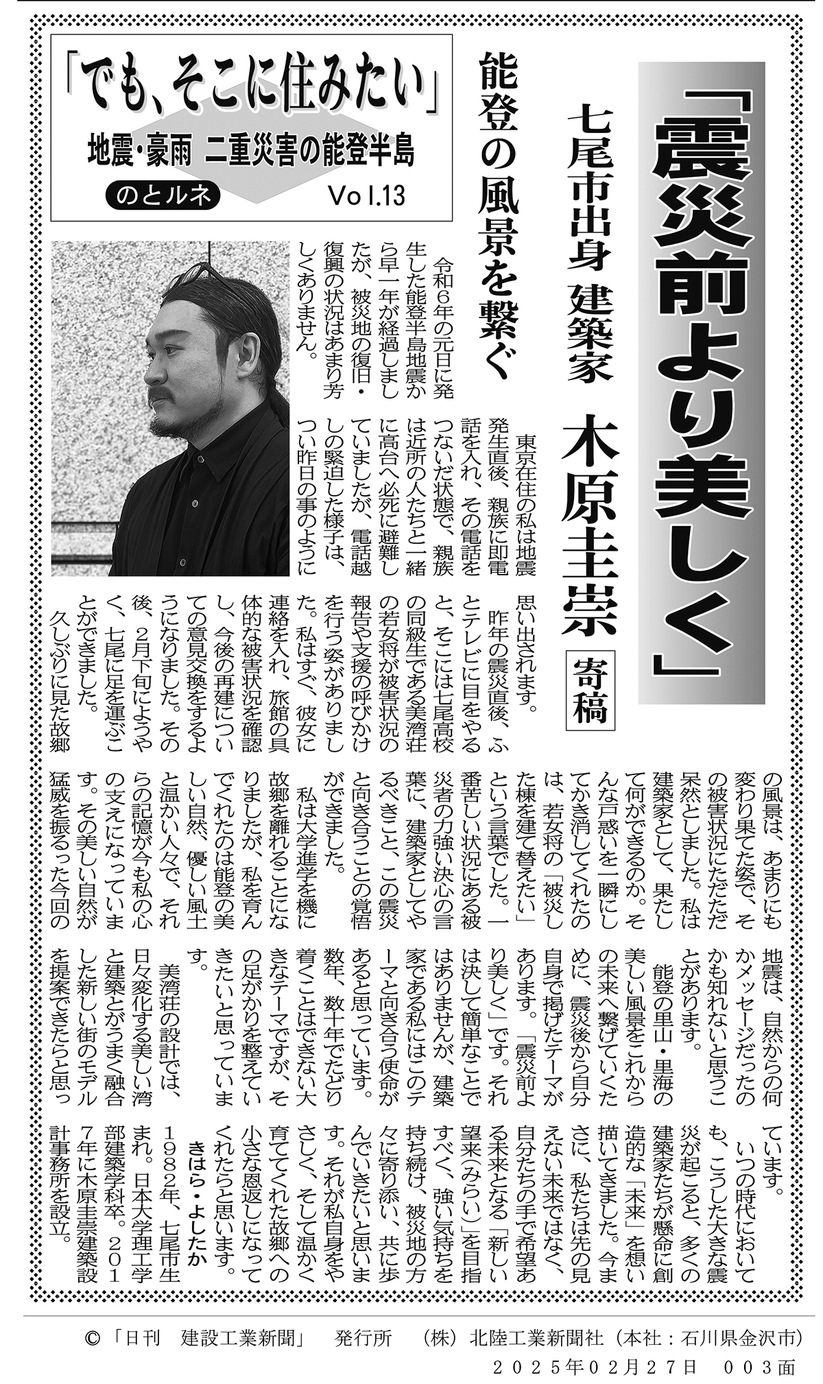 この記事は、故郷への温かい想いを胸に一歩ずつ再建に向けて進む建築家の木原圭崇氏の記録です(連載記事となります)